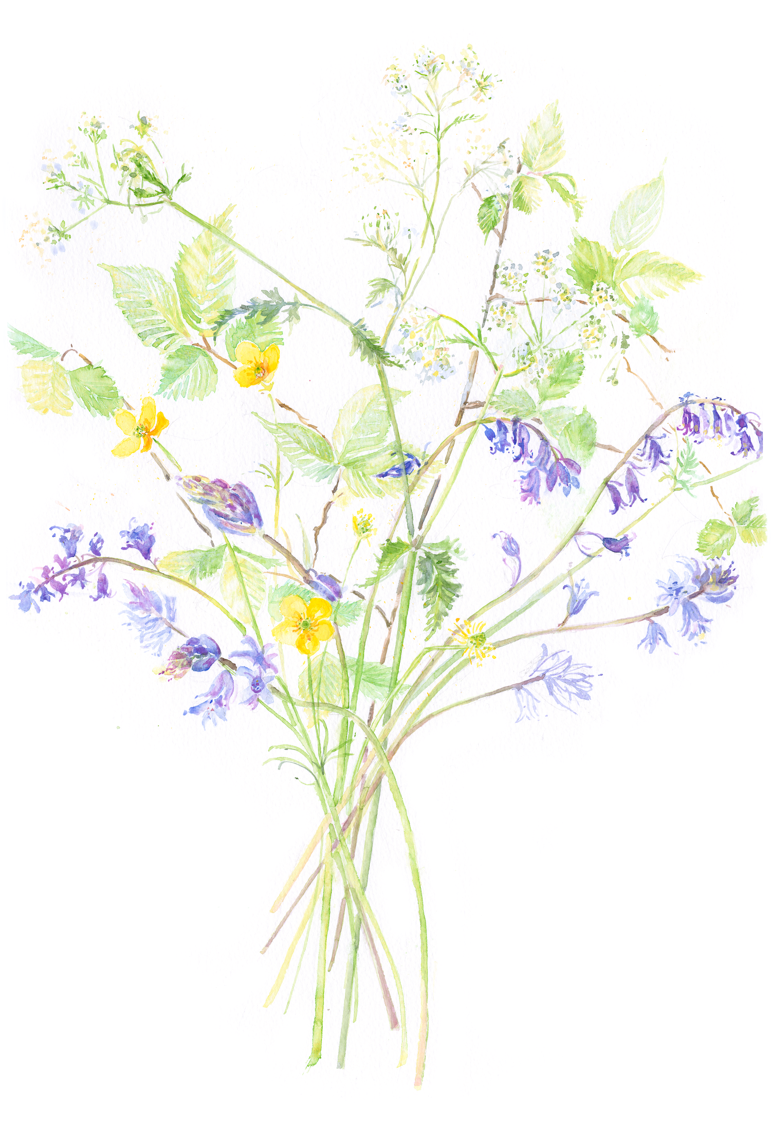An original watercolour by Nicola Watters. Tangled stems of bluebells, buttercups, hazel leaves and Queen Anne's lace.